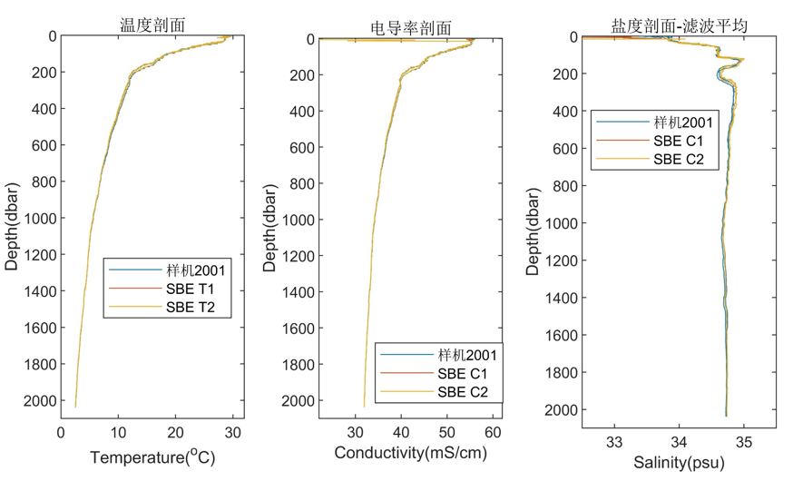 为验证所研发温盐深传感器的性能,研究期间进行了多次海试与比测。样机多次跟随“探索二号”和“深海勇士号”等科考船进行深海原位探测,在与国际性能较高的SBE 911+产品的比测中,显示出同等级别的快速响应能力和高精度测量水平。在与国际上使用较广的海鸟公司产品的原位静态精度比测中,三台样机比测误差小于0.003psu,达到了国际高精度水平。