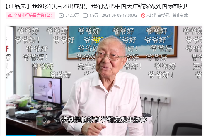 2021年,85岁的汪品先又多了一个身份——B站“网红”UP主。视频中,他身着朴素衬衫,将深海奥秘娓娓道来,弹幕纷飞:“这才是顶流!”“看院士讲课热泪盈眶。”