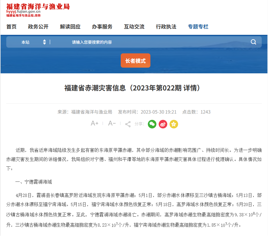 2023年4-5月福建近岸海域发生多起东海原甲藻赤潮