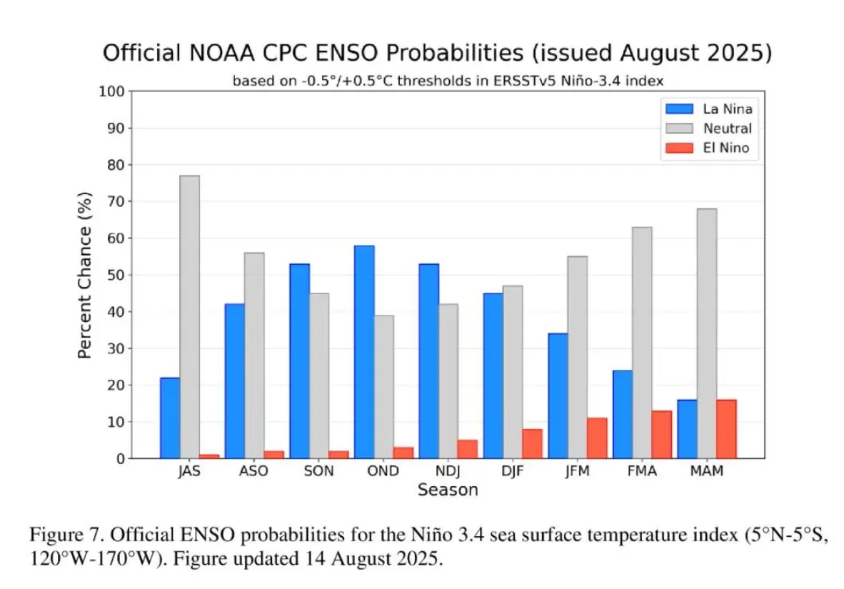 根据官方监测数据显示,2025年1月,持续一段时间的弱拉尼娜现象正式结束。进入春夏季后,赤道太平洋海温逐步回归至 ENSO 中性状态,气候系统暂时处于相对平稳的过渡阶段。