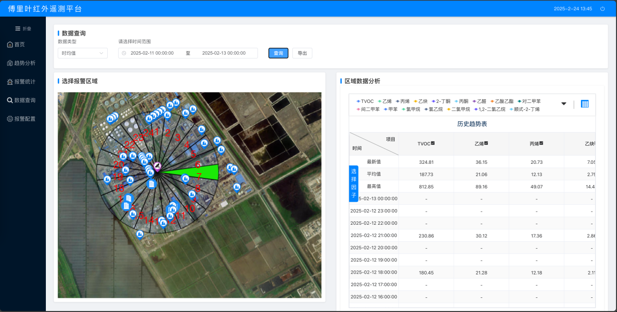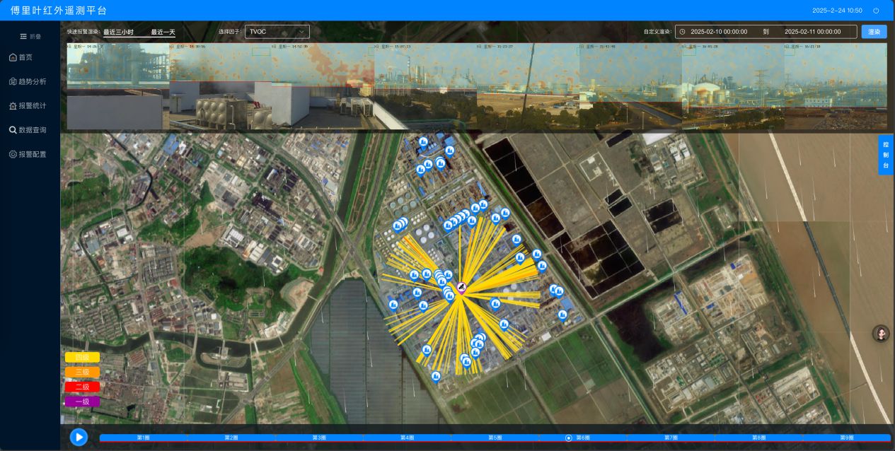 对报警数据及扫描图像进行GIS地图展示,直观展示其区域污染范围、分布情况,支持时 间轴回溯。