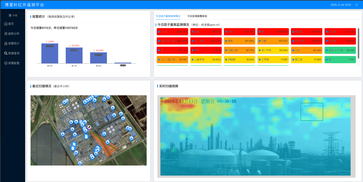 单台设备可覆盖方圆5公里可见范围内的排口、储罐、火炬等污染源,可监测500种因子: