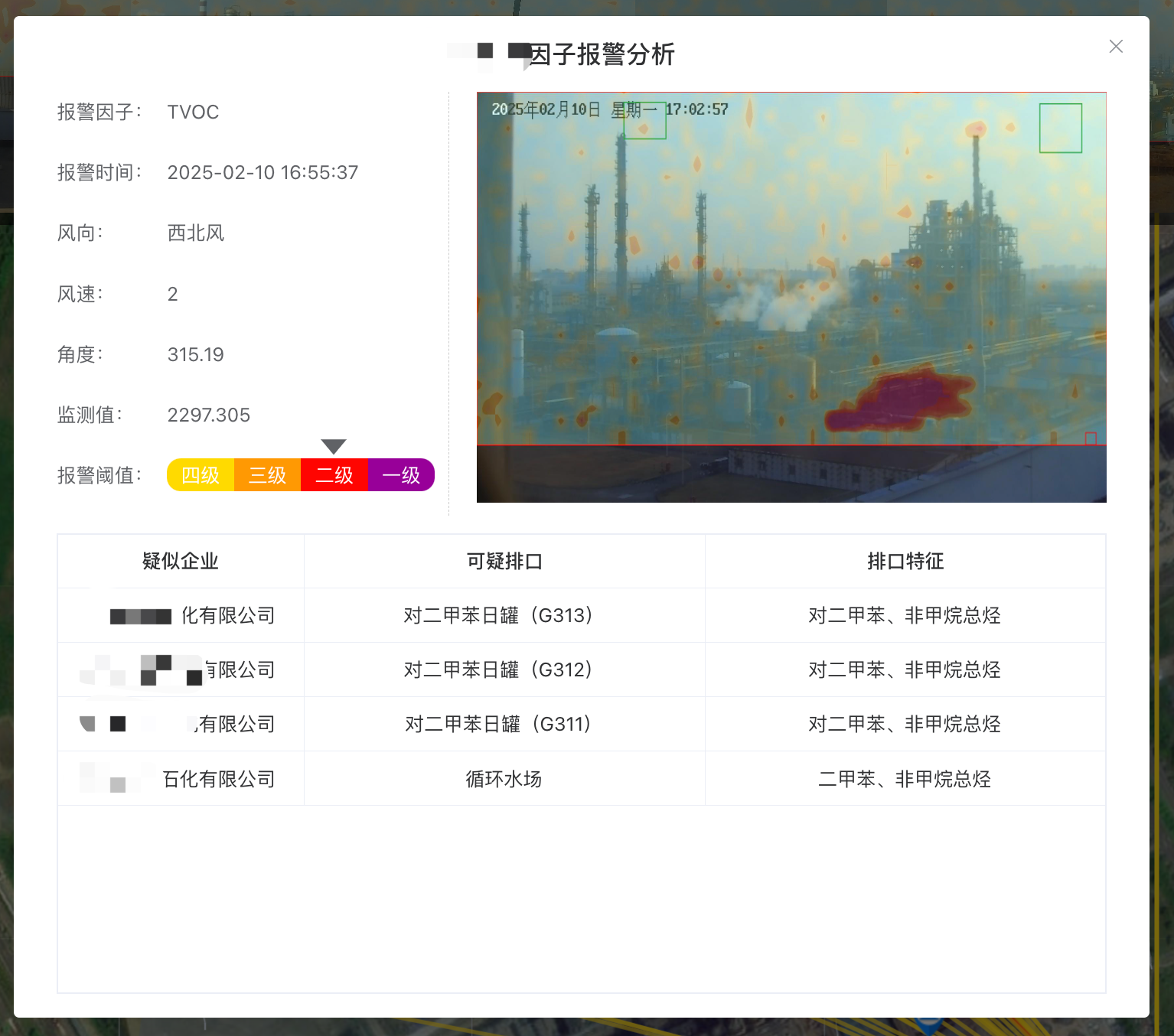 结合地图扫描范围内的污染源及污染源的特征因子进行初步溯源,锁定嫌疑企业及排口,给出线下排查建议。